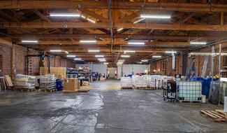 The building's architectural character is defined by exposed brick walls and soaring bow-truss ceilings that reach up to 25 feet, with 15 feet of clear height. The property also offers ground-level pedestrian doors and vehicle garage doors at both the front and rear of the building.