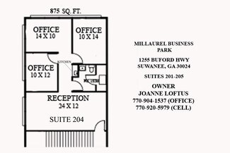 This office is located three miles from I-85 and one mile from downtown Suwanee. It has three private offices and a 25 x 12 reception or conference room