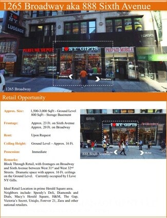 Block Through Second Floor at 1265 Broadway/ 888 Sixth Avenue between 31st and 32nd Streets, with a dedicated entrance and elevators on Broadway. The space offers great visibility through window, awning and blade signage.