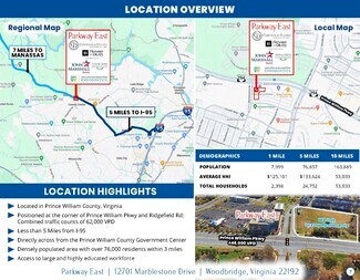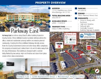 Three-story Class A office building located in County Center, Prince William county's premier address where office, retail and residential converge within one master planned community. Fronting the Prince William Parkway directly across from the County Government Center and other large office complexes. The property is located just 5 miles from I-95 and 10 minutes away from the City of Manassas. This building is designed with a central lobby flanked by two wings. High end finishes and store-front glass create a first-class environment.