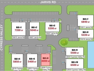 The property is a 4,000 SF shell office/warehouse located in 12826 Cypress Valley Rd, Jarvis Business Park, fronting on Cypress Valley Road and located minutes from Hwy 290 and Cypress Methodist Hospital. It is suitable for light distribution or light manufacturing and includes a wide parking and truck court area accommodating 18-wheeler maneuverability. The site has no zoning, with professional deed restrictions in place. Utilities include water from HMW SUD, private septic (avoiding MUD taxes), and pre-wiring for fiber internet. The building is Type II-B metal construction with a standing seam roof, reinforced concrete slab, R-20 wall insulation, and R-30 roof insulation. Clear height ranges from 22' at the front eave to 18' at the rear. Structural features include one 12' × 14' wind-rated steel sectional overhead door, black anodized storefront glazing, LED high-bay lighting, exterior wall-pack lighting, and under-slab conduit for future office build-out. The building uses metal panel walls with EIFS and stone accents and includes bollards and track guards at the overhead door. The property is not in a flood zone.