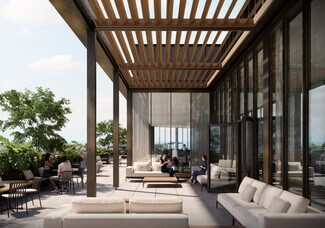 - Large outdoor ground floor plaza with cafe and art sculpture