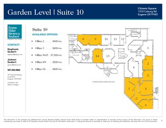 Citizens Square on Coburg Road | Garden Level Suites  • Small office suites available; ideal for single tenant occupancy  • High traffic, North Eugene location on Coburg Road at Cal Young  • Shared use of restrooms, kitchenette, conference room, and coffee bar  • On-site parking for clients/customers SUITE 2 - $400/month. SUITE 3 - $400/month. SUITE 5/6/7 - $700/month. SUITE 8/9 - $500/month. SUITE 14 - $600/month.  • Rent is fully serviced
