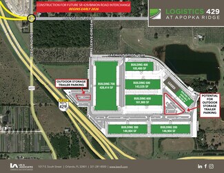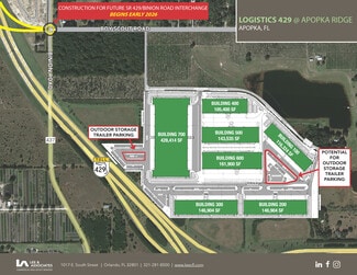 Logistics 429 @ Apopka Ridge is an 78 acre development that is master planned to accommodate 1,250,000 SF. Phase one will consist of two rear load buildings. Building 100 is 116,324 SF and building 200 is 146,904 SF. Phase II will include buildings 300 – 700. The park can accommodate users from 105,000 SF to 950,000 SF in a single building. Ownership will also consider select sites for Build to Suit for sale. Warehouse