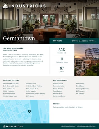 Industrious Germantown provides a robust collection of all-inclusive amenities and best-in-class services. Members have access to a large communal pantry stocked with craft coffee, tea, and snacks, daily breakfast, a wellness room, conference rooms, phone booths, and copy/print stations. The Neuhoff District features a tenant amenity lounge with a roof terrace, a large meeting room, a fitness center, car and bike valet, a riverfront amphitheater, and direct access to the Greenway and future barge amenities on the Cumberland River. Within this vibrant neighborhood are several inventive retailers, historic homes, and unique bars and restaurants, such as Rolf & Daughters, Henrietta Red, City House, and more.