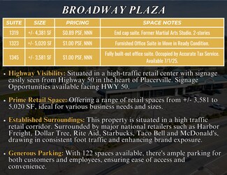 Broadway Plaza in Placerville, CA, offers a strategic leasing opportunity for businesses aiming for high visibility and strong foot traffic, thanks to its location off Highway 50 and proximity to major retailers like Harbor Freight, Dollar Tree, and McDonald's. With available spaces ranging from 3,581 to 5,020 square feet, the center caters to a variety of business needs, from retail to office setups. Tenants benefit from 122 parking spaces, prominent highway signage opportunities, and a mix of local and national brands, making it an attractive location for both established businesses and new ventures seeking growth and visibility in a bustling retail corridor.