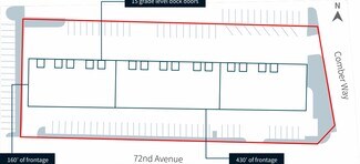 The Property consists of a 16-unit, 34,560 SF building situated on a 1.63-acre (70,932 SF) parcel in Surrey’s Newton neighbourhood. This highly functional building offers 20’ ceiling heights in the warehouse and office space on the mezzanine level. Additionally, some units have ground level showroom areas. The Property features 70 parking stalls, 15 grade level loading doors with a front office/rear loading configuration and a gated loading court. The Property offers exceptional visibility with approximately 430 feet of frontage along 72nd Avenue and 160 feet along Comber Way.
