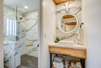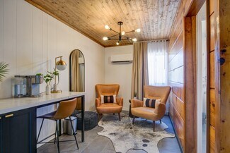 Inside, the motif of knotty-pine evokes cozy nostalgia, complemented by tasteful décor, pastel-pink tiled showers, and luxe linens. Guests consistently remark on its whimsical character and authentic mountain-lodge feel.