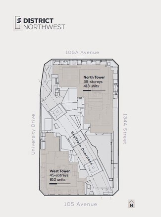 District Northwest presents a rare and immediate development opportunity in the heart of Surrey City Centre. This fully rezoned and building permit-ready 2.03-acre site at 13438 105A Avenue is offered for sale by court order, free and clear of encumbrances. The approved development plan features two striking residential towers—39 and 45 storeys—comprising 1,023 market condominium units and a dedicated on-site daycare. With 583,000 SF of saleable residential area and a total approved FSR of 717,418 SF, the site is primed for immediate relaunch using existing marketing materials and presales momentum. Designed by IBI Group and BYU Interior Design, the project includes premium finishes, built-in air conditioning, and curated amenities such as The Canopy Courtyard with outdoor fitness, coworking spaces, and concierge-serviced lobbies. With 755 parking stalls and proximity to major transit and retail corridors, District Northwest is a compelling opportunity to establish a landmark presence in one of Metro Vancouver’s fastest-growing urban hubs.