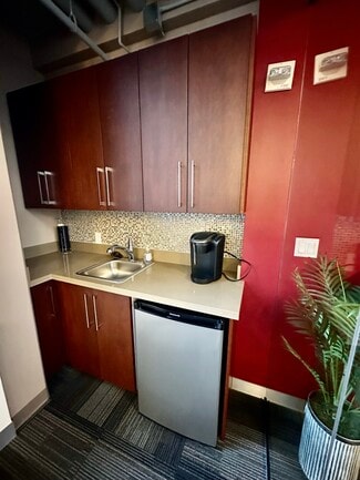 The suite is fully furnished and move-in ready, offering six desks, five cubicles, and an enclosed glass conference room complete with a conference table and seating. A small reception area welcomes clients, while a convenient kitchenette with sink and mini refrigerator adds everyday functionality.