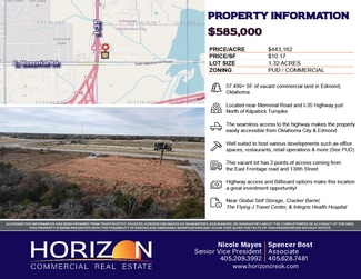 Prime industrial land for sale in Edmond, OK –1.32 acres strategically zoned for commercial use. Located near Memorial Road and I-35 Highway, this high-traffic area with easy highway access is ideal for a wide array of businesses. Don’t miss this opportunity to invest in a great location. Act fast and shape the future of this prime location!