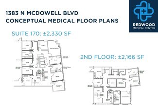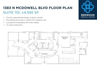 Redwood Medical Center, North Petaluma's new premier class 'A' medical outpatient project. The strategic re-positioning of 1383 North McDowell Boulevard by local ownership group, Basin Street Properties, responds to the growing need for Petaluma healthcare providers to service the local population from modern, high-quality facilities. Redwood Medical Center features versatile office layouts to accommodate various medical practices, with ADA and HIPAA-compliant build-out options.