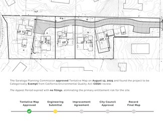 Exceptional opportunity to acquire 1.63 acres in the heart of Saratoga’s prestigious Golden Triangle. Approved under Builder’s Remedy (August 2025), the project includes Tentative Map Approval for five luxury single-family homes plus two ADUs, meeting Silicon Valley’s demand for upscale, multi-generational housing. The property currently generates $207,540 in gross annual income, helping offset carrying costs during the entitlement period. Next steps include securing Final Map Approval and preparing for site development, giving developers flexibility to refine plans before breaking ground. The community features a tree-lined entrance and a new private drive, Steele Dr, offering a sense of arrival and maximum privacy. The architectural vision embodies “quiet luxury” with timeless design, warm organic materials, seamless indoor-outdoor living, and curated layouts tailored for today’s discerning buyer. High-value exit potential drives the appeal for developers. With limited land availability, affluent demographics, and strong demand, this offering represents a rare opportunity in one of the Bay Area’s most supply-constrained luxury markets. Located within walking distance of award-winning schools, boutique shopping, fine dining, and downtown Saratoga, with easy access to Highway 85 and proximity to Silicon Valley’s top employers, including Apple, Google, NVIDIA, and Meta.