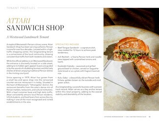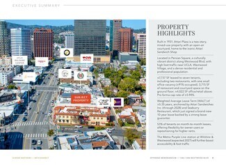 MIXED-USE PROPERTY ANCHORED BY TWO RESTAURANTS Strong Lease Profile – Weighted Average Lease Term (WALT) of ±5.35 years, anchored by Attari Sandwiches Inc.(through 2028) and Seaburry Restaurant, which just signed a brand-new 10-year lease backed by a strong lease guarantor. Attari Plaza, located at 1386-1388 Westwood Blvd, Los Angeles, is a prominent mixed-use property in the heart of Persian Square, a vibrant retail and dining corridor. The ±7,530 SF two-story building on a 6,650 SF lot includes ±3,715 SF of restaurant space with an open-air courtyard and ±4,022 SF of office space. The property is leased to seven tenants in total, including two restaurants, with one small office space currently vacant.