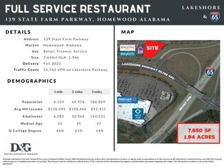 139 State Farm Parkway Homewood, Alabama Former Landry's Size: 7,650sf; 1.94a Delivery Fall 2022 Traffic Count 55.762 VPD on Lakeshore Parkway