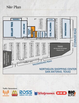 Located at Nacogdoches Rd and O' Connor Rd in growing Northeast San Antonio. Shared intersection with HEB, Big Lots, McDonald' s, Ross Dress for Less, Walgreens among others. Tenants include Dollar Tree, Five Below, CSL Plasma, and many others. SEC Nacogdoches Rd at O'Connor Rd
