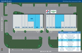 Taylor Place is a 34,895 sq. ft. neighborhood retail center situated in the bustling retail hub at the intersection of Beach and Hodges Boulevards. Located on Beach Boulevard, a major east-west corridor leading to the beaches, Taylor Place offers excellent visibility and serves the expanding population in the West Beaches sub-market. The center benefits from signalized intersection access and is well-occupied with a diverse tenant mix, including Domino's Pizza, Wing Stop, a dance studio, childcare services, a dentist, pet care, a chiropractic office, and more.