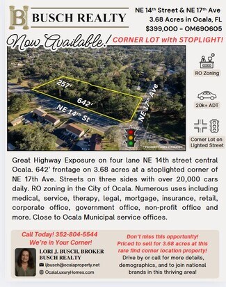Great Highway Exposure on four lane NE 14th street central Ocala. 642 front feet on this 3.68 acres at a stoplighted corner of NE 17th Ave. Location Location. Streets on three sides. See Aerial. Over 20,000 cars daily. RO zoning in the City of Ocala. Numerous uses. Could be plaza for medical, service, therapy, legal, mortgage, insurance, retail, corporate office, government office, non-profit office and more. Please drive by today. Residential Office allows residential as well. Close to the City of Ocala Municipal service offices. Priced to sell for 3.68 acres at this fine location. Rare find corner property. City water and sewer here. Multi tenant office use ideal, or single user. Perhaps residences over offices.