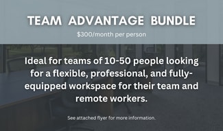 The building features a newly renovated lobby, corridors, elevator cabs, and other common areas. The coworking space provides private offices starting at $450, conference rooms starting at $30, coworking spaces starting at $99, and professional addresses starting at $50. There is prominent monument signage that offers company identity at the main building entry.