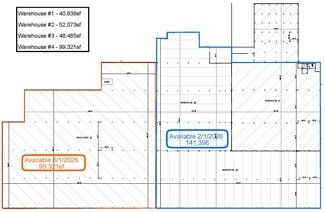 The site offers phased occupancy with ±141,383 SF available October 2025 (divisible into multiple configurations down to ±40,000–50,000 SF) and an additional ±99,321 SF coming online in May 2026. Key features include 30–32’ clear height, robust power (480V upgradable to 4,160V / 1,200A), fully sprinklered wet-pipe system, six grade-level doors plus dock loading, and multiple small warehouse offices plus a ±4,000 SF standalone office.