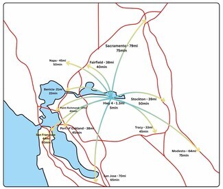 Strategically located just 1.3 miles to Hwy 4 and minutes to major regional hubs: 45 minutes to the Port of Oakland, 40–50 minutes to Stockton, Benicia, Tracy, Fairfield, and San Francisco. Multiple signage opportunities, yard storage, and a transferable indoor boat & RV storage use (confirm with City) make this a versatile opportunity in a high-demand corridor.