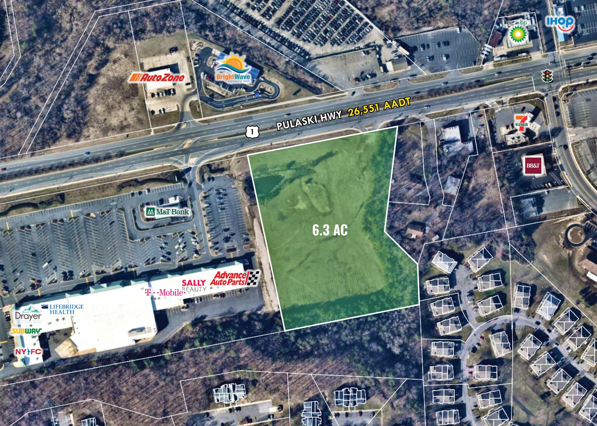 6.3 Acres of commercial land for sale or lease, adjacent to Woodbridge Center (Advance Auto Parts, Lifebridge Health, Drayer Physical Therapy, M&T Bank). Excellent visibility (26,551 cars/day) and frontage (530' ±) on Pulaski Highway/Rt. 40, Edgewood's major retail/commercial corridor.