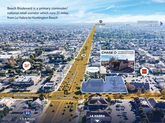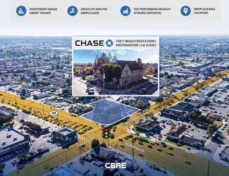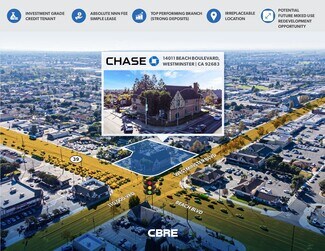 Located at the high-visibility intersection of Beach Boulevard and Westminster Boulevard, 14011 Beach Blvd presents a rare opportunity to acquire a top-performing Chase Bank branch in the heart of Orange County. This ±14,774 SF, two-story freestanding building sits on 1.05 acres across three parcels, with ±110,000 vehicles per day passing by, ensuring exceptional exposure. The property benefits from a long-standing tenancy by JP Morgan Chase Bank, the largest financial institution in the U.S., which has operated at this location since 1989 and recently exercised an early 5-year lease extension through February 2032.