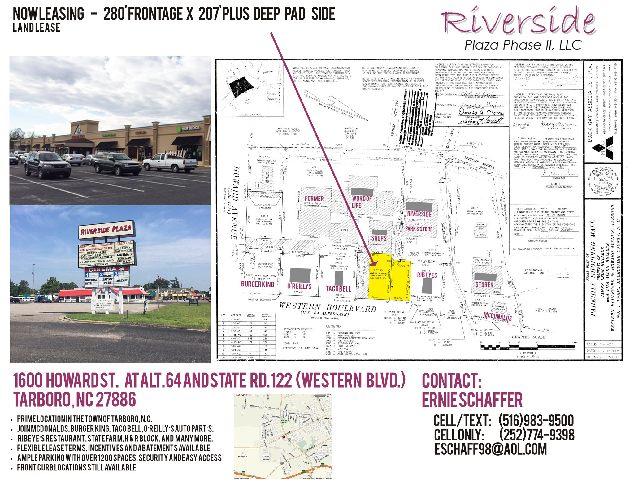 Retail pad site available at the riverside plaza at the busiest intersection in Tarboro, across from the high school 260 feet of frontage by 200 feet in depth. This pad site is in the middle, at the front of the center. The pad site is in between Taco bell, Mcdonalds, Burger king, ribeye's steakhouse and oreilly's auto parts. The center features a Roses dept. store, The Salvation Army family store, LaRancharita restaurant, Furniture Warehouse-Ashley Furniture, Boost Mobil,2000 Nails & Spa, H&R Block, Cinema III, and more .