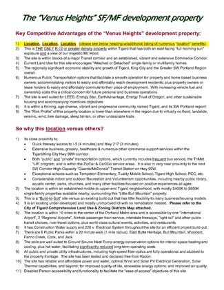 * What's to love most about the location is its LOCATION! Including the view-line of Mt. Hood and the fact that the property sits just 5-blocks from the State Hwy. 99W arterial & Commerce Corridor, 2 miles from Portland city limits, 3/4 mile from I-5 freeway, in a Middle-to-Upper-Class & Income area, within City Limits of Tigard (more specifically South Tigard), with all utilities at the property frontage, and it's readily accessible at roughly 5 blocks distance between the site, its planned structure(s), and that 24/7 Public Transit Corridor within the State Hwy. 99W arterial.