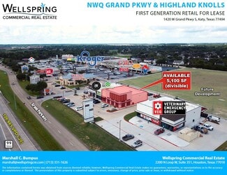 Parkway Marketplace is located at the NWC of Grand Parkway and Highland Knolls in Katy, TX. Up to 55,000 SF of retail, restaurant and service space is available.
