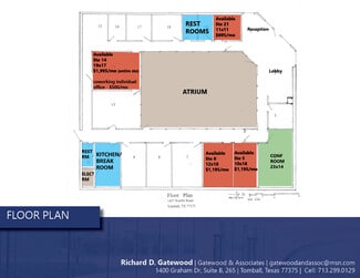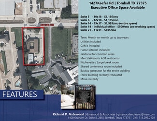 Suite 5 - 10x18 - $1,195/mo Suite 6 - 12x18 - $1,195/mo Suite 14 - 19x17 - $2,595/mo (entire space) Suite 14 - individual office - $500/mo (co-working space) Suite 21 - 11x11 - $695/mo Term: Month-to-month up to two years Utilities included CAM’s included Public Internet included Janitorial for common areas Men’s/Women’s ADA restrooms Kitchenette / Large break room Shared conference room included Backup generator for the entire building Entire building recently renovated Move-in ready
