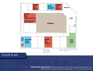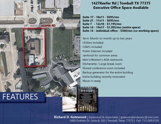Suite 17 - 10x11 - $695/mo Suite 21 - 11x11 - $695/mo Suite 7 - 12x18 - $1,195/mo Suite 14 - 19x17 - $2,595/mo (entire space) Suite 14 - individual office - $500/mo (co-working space) Term: Month-to-month up to two years Utilities included CAM’s included Public Internet included Janitorial for common areas Men’s/Women’s ADA restrooms Kitchenette / Large break room Shared conference room included Backup generator for the entire building Entire building recently renovated Move-in ready