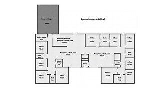 The approximately 4,600 square foot building features a highly functional layout including 10 private offices, 5 bathrooms (including 2 ADA compliant), security room, two large reception/work areas, and two storage rooms with built-in cabinetry and washer/dryer hookups. The property also includes a utility room, covered carriage porch entrance, and dedicated space for a kitchen or kitchenette with hookups already in place.
