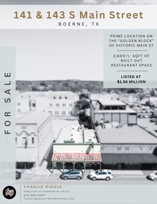 JUST LISTED – Prime Downtown Boerne Opportunity! ?? 141 & 143 Main St. – Located on the "Golden Block" of Historic Main Street, this 2,600+/- SQFT restaurant space is a rare investment at $1.56M. Currently leased through October 2025, it offers immediate income potential! The rear portion allows for future development under Downtown Historic Business Overlay zoning—perfect for entertainment, office, or retail. Rich in history—this building was once Boerne’s town saloon! ?? Call Charlie Riddle at 210-383-0007 for details!