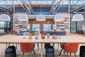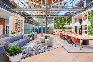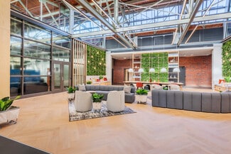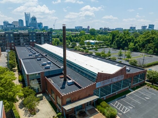 Once the headquarters of Grinnell Waterworks, this creative office building sits on the buzzing West Morehead Street. Originally constructed in 1930, the building’s industrial details and iconic architectural elements, like its smokestack, have been preserved. The office spaces within offer tons of natural light, historic character, and open space for a flexible work environment.