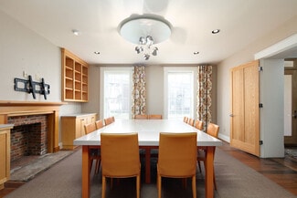 Originally constructed in 1840, the two-story building offers appx. 6,848 SF above grade plus an additional 410 SF of finished lower-level space, ideal for storage or supplemental workspace. Upon entry, the first floor greets visitors with original hardwood floors, exposed brick, and contemporary finishes. Highlights include a distinguished boardroom with folding privacy doors, granite counters, and a fireplace that flows seamlessly into a spacious library featuring custom maple cabinetry and quartz countertops. A tiled kitchenette with dishwasher, two restrooms (including a full bath with shower), and direct access to a flexible garage space with a drive-in door further enhance the main level. An elevator and steel-wrapped open stairwell with expansive windows provide convenience and natural light throughout.