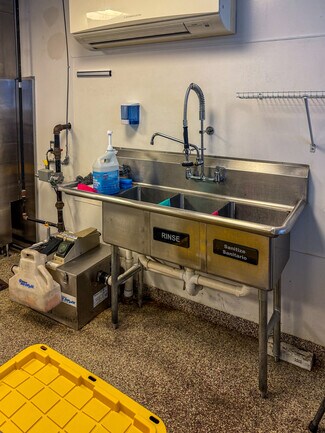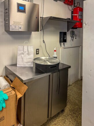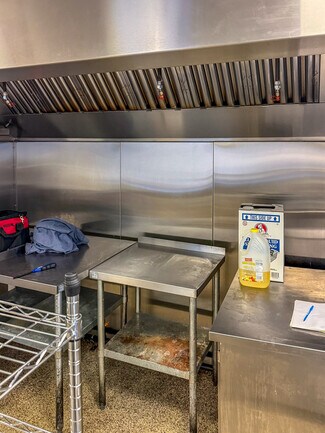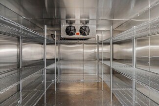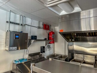 Interior features include a 9-foot commercial hood with fire suppression system, make-up air system, natural gas service, walk-in freezer, heat and air-conditioning, and a private bathroom. A second-floor area provides additional storage capacity, maximizing the efficiency of the main service level.