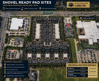 Rare opportunity to acquire shovel-ready pad sites in the heart of Sugar Land, Texas, located along the highly trafficked Voss Road corridor near Highway 6. This ±5-acre development is fully entitled, with approved plans, permits, and architectural drawings, allowing for immediate groundbreaking. The project is thoughtfully designed with two premium frontage pad sites (Buildings A & B) ideal for retail or medical users, and five rear office condo pad sites (Buildings C–G) suited for professional office development. The flexible layout allows investors, developers, and owner-users to purchase sites individually and execute their own vision. Surrounded by dense residential communities, strong retail presence, and anchored by Kempner High School and nearby daily traffic drivers, the property offers excellent visibility, accessibility, and longterm growth potential. This is a true plug-and-play development opportunity in one of Sugar Land’s most active and desirable submarkets.