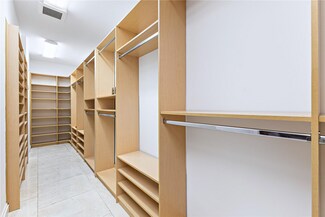 Interior features exposed angled beam ceilings, recessed halogen lights with dimmers, cove lighting, terracotta floors, custom built-ins, and California closets