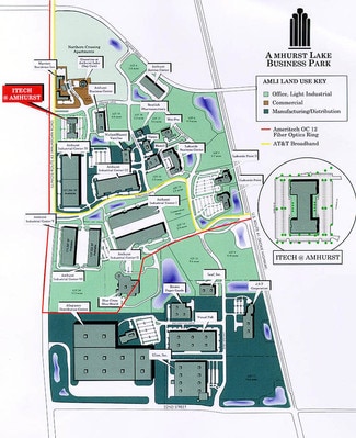 I-Tech at Amhurst is located within the 432-acre commercial development known as Amhurst Lake Business Park located in Waukegan, Illinois. This business park is known for providing a range of industrial and office spaces suitable for various types of businesses. Its location offers convenient access to key transportation routes, such as I-94 and Route 120, Route 137, Route 41 and Waukegan Road making it an ideal spot for companies needing good logistical connections. The area has a mix of light industrial, office, and research-and-development spaces.