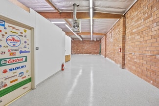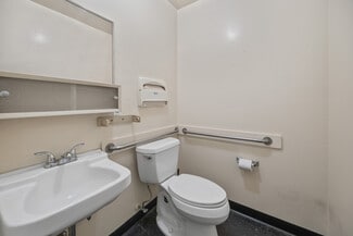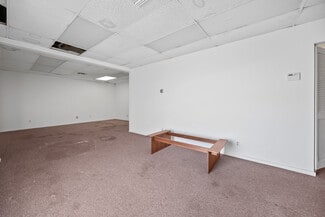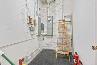 The building features one grade-level garage opening with approximately 8.5-foot clear height and is functionally partitioned with warehouse and storage/garage space on one side and a dedicated office/reception area on the other, providing operational flexibility for a range of business types.