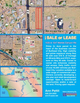 Prime 2+ Acre parcel in the heart of the business corridor of Bullhead City. High visibility and prime exposure along Hwy 95 with over 578 ft. of frontage on Miracle Mile and 578 ft. exposure on Hwy 95 side. Corner to corner site enhances visibility and access. Daily traffic count of over 40,000 vehicles per Bullhead City. Location suitable to a wide range of commercial uses. Owners currently developing a site plan and retail development concept. Open to build-to-suit opportunities and/or a sale of the land. C-2 zoning.