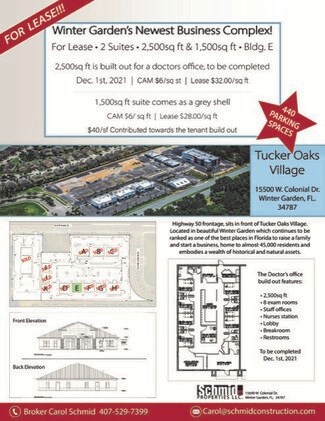 Tucker Oaks Village-Winter Garden is centrally located near Ocoee, Clermont, & Oakland. This 5000 sq ft. building has one suite left at 1300 sq. ft. Grey shell built to suit. Plenty of parking and in close proximity to the turnpike, 429, & 408.