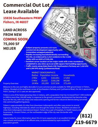 Welcome to the rare and highly desirable 0.9-acre commercial plot available for NNN ground lease in Fishers, Indiana. Situated at the southwest corner of Southeastern Parkway and Cyntheanne Road, the site is approved for PUD-C Zoning (C-1/C-2 uses are also approved).