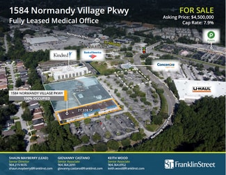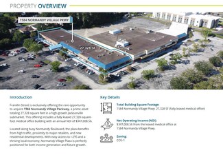 Franklin Street is exclusively offering the rare opportunity to acquire 1584 Normandy Village Parkway, a prime asset totaling 27,328 square feet in a high-growth Jacksonville submarket. This offering includes a fully leased 27,328-squarefoot medical office building with an annual NOI of $342,496.44. Located along busy Normandy Boulevard, the plaza benefits from high traffic, proximity to major retailers, and new residential developments. With easy access to I-295 and a thriving local economy, Normandy Village Plaza is perfectly positioned for both income generation and future growth.