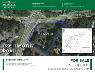 Located at the southeast corner of Epps Bridge Parkway and Timothy Road, this 2.82-acre assemblage offers excellent commercial visibility and accessibility, serving as a gateway to the thriving Epps Bridge commercial corridor and neighboring Oconee County. Positioned near major retail powerhouses, including Walmart, Costco, and the Epps Bridge Centre, this site is perfectly situated for maximum commercial impact. The area boasts high traffic counts and rapid development, making it an ideal candidate for a medical office complex, upscale retail center, mixed-use development, or professional office. While currently zoned RS-25 (Single Family Residential) and improved with a single-family home and two duplexes—offering immediate holding income—the site is prime for rezoning to match the surrounding commercial landscape. The 2.82-acre footprint provides ample space for a significant development footprint, with crucial frontage on both Timothy Road and Epps Bridge Parkway.