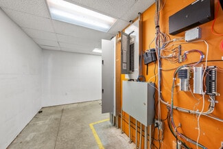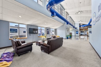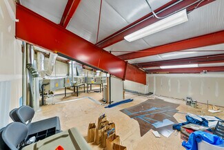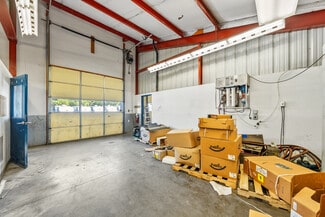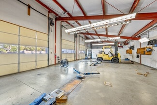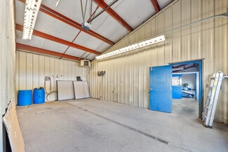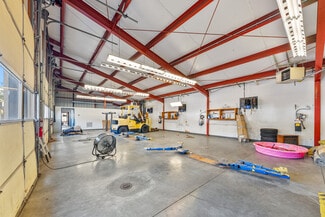 The rear shop building is a similar clear-span steel-frame building with matching exterior styling. Enjoying a dedicated public entrance with a service counter, private offices, kitchen and restroom, the shop includes (6) 10'x10' overhead doors, 4 hydraulic lifts, multiple gas heaters, in-slab drains, and 16' max clear height.