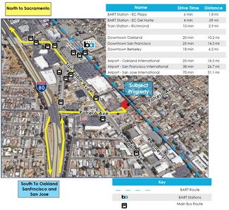 Being in the heart of the East Bay, the building is within a two (2) mile distance to both El Cerrito Del Norte and El Cerrito Plaza Bart stations, and Highway 80. Oakland and San Francisco including their respective airports are all within a 10-to-25 mile distance.