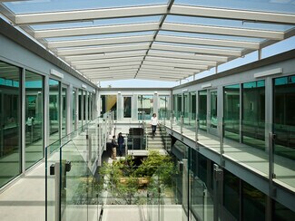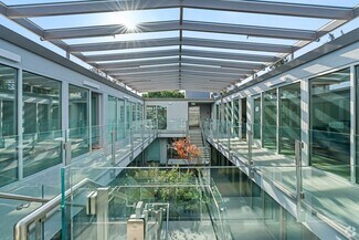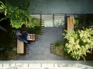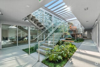 Combining the character of 1960s architecture with a modern update by LNAI Architecture, this sleek building has a steel monument frame sporting lightweight aluminum slats coated with a synthetic film to give the look of wood (used as screen shields and a twisting feature above the entryway). A Zen-inspired central courtyard, topped with a gabled skylight, provides a calming focal point for the building. Landscaped with greenery, concrete pavers, and wood benches, the courtyard creates a welcoming indoor-outdoor ambiance. Stairs on each side of the quad lead to second-floor suites overlooking this tranquil space, enhancing the building’s open and airy design.