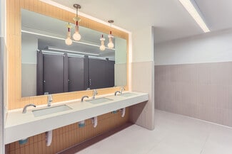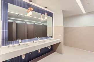 The building features expansive, open floor plates on the lower (22,049 RSF), first (23,549 RSF), and second (27,513 RSF) floors, designed to accommodate a wide range of uses—from creative offices and corporate headquarters to boutique retail or collaborative workspaces. Each level is outfitted with key infrastructure including multiple restrooms, elevator and stair access, and natural light from large windows and atrium-style openings.